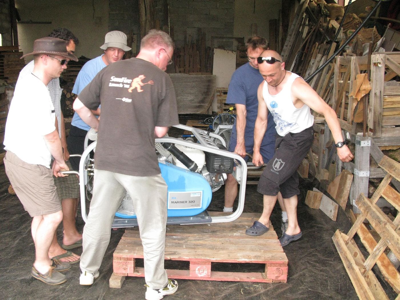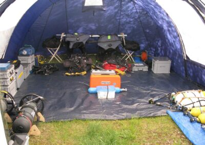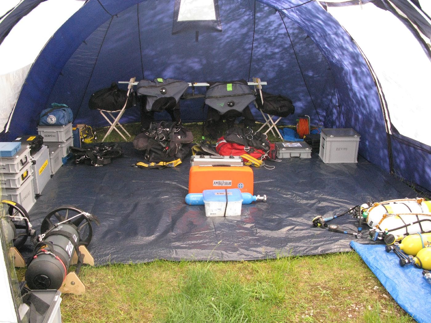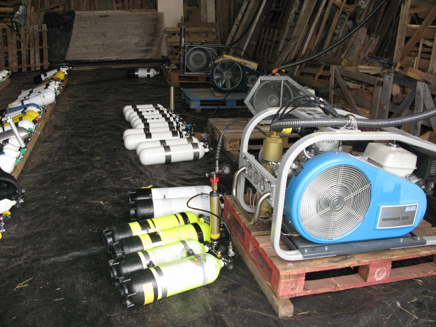 Aehnlich wie letztes Jahr sorgten 3 Bauer Capitanos mit 140-160 l/min sowie der megacoole Mariner mit 320 l/min von Philippe für den notwendigen Druck in den vielen Flaschen…und für zügiges füllen. Selten hat das so gut und reibungslos geklappt wie dieses Jahr, trotz Ausfall über eine Woche eines der Capitanos (Federbruch Einlassventil 3. Stufe). Hier zeigte sich, dass sogar weibliche Toilettenutensilien z.B. zum Abziehen einer Dichtfläche eingesetzt werden können….