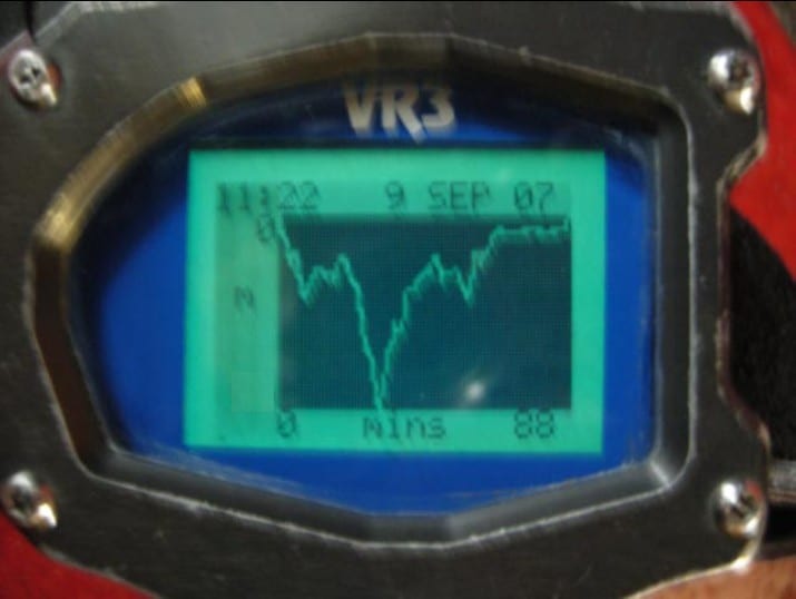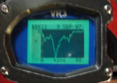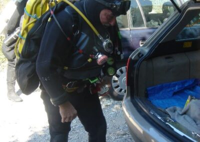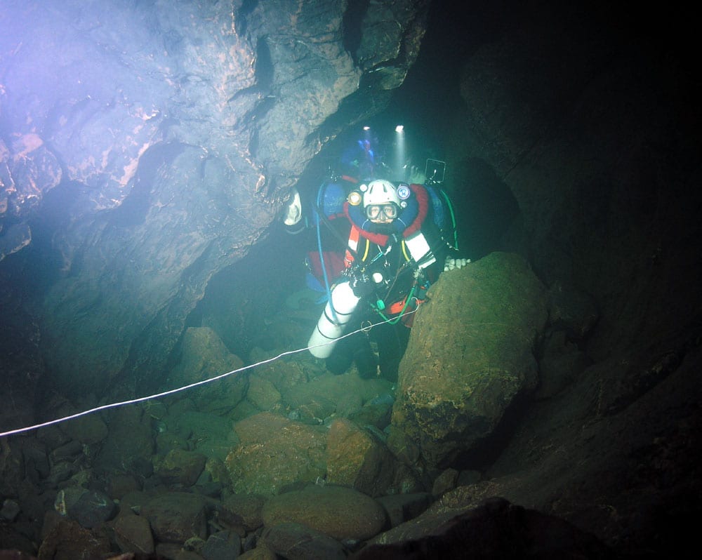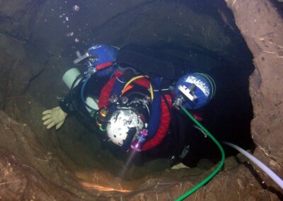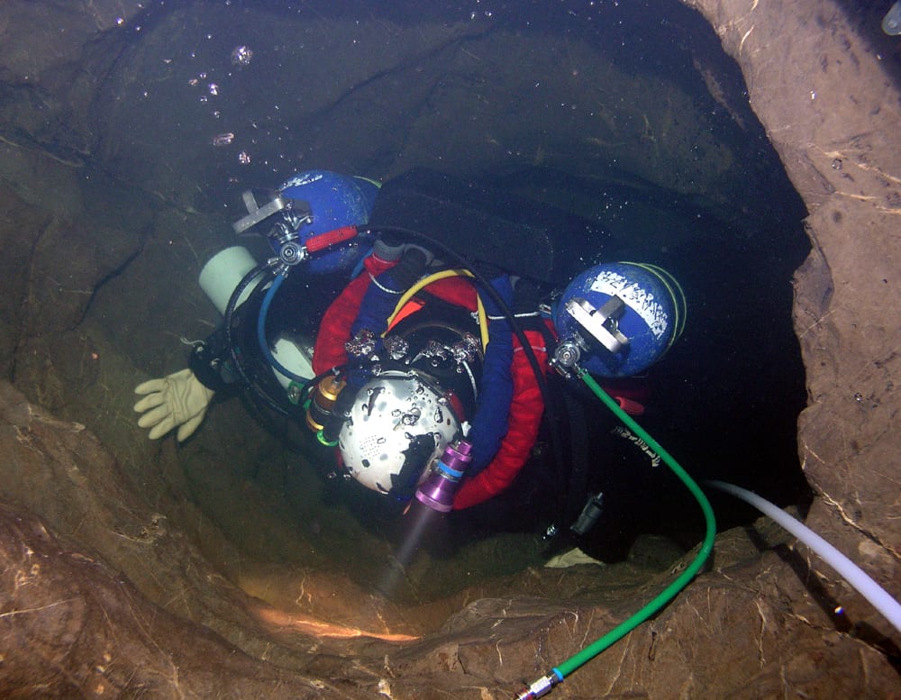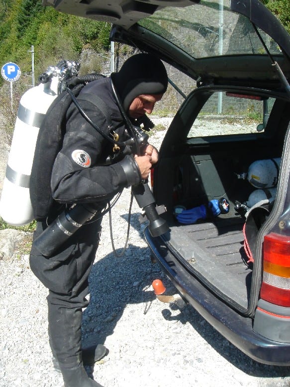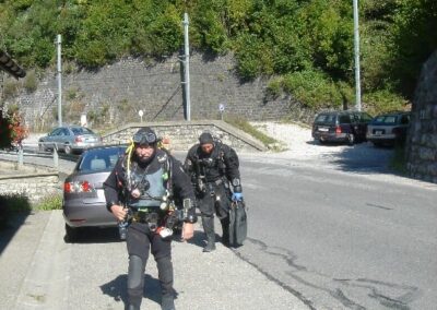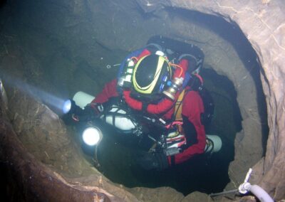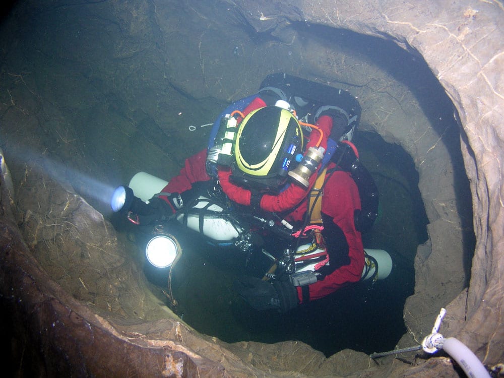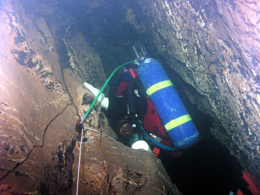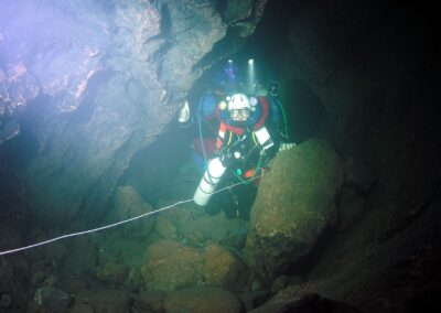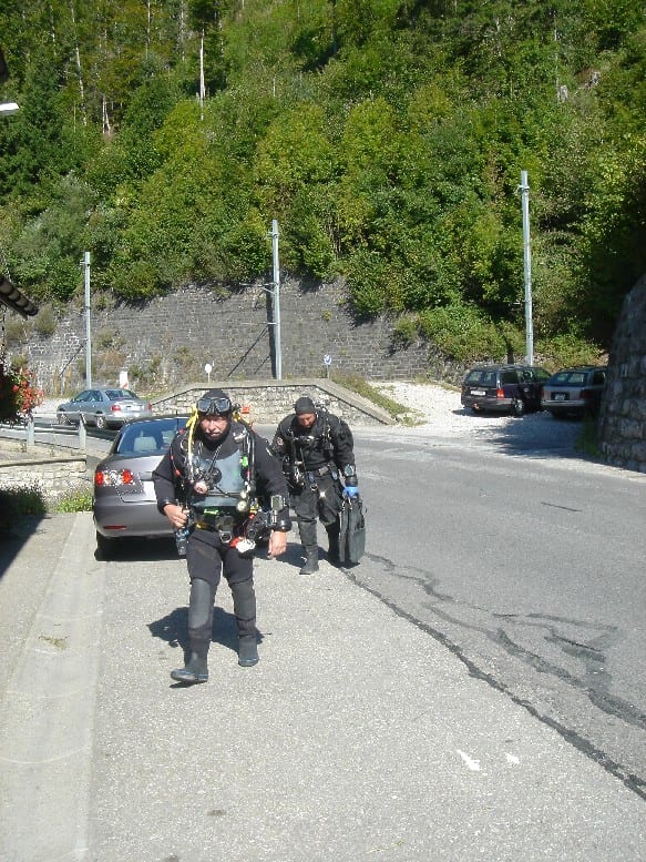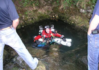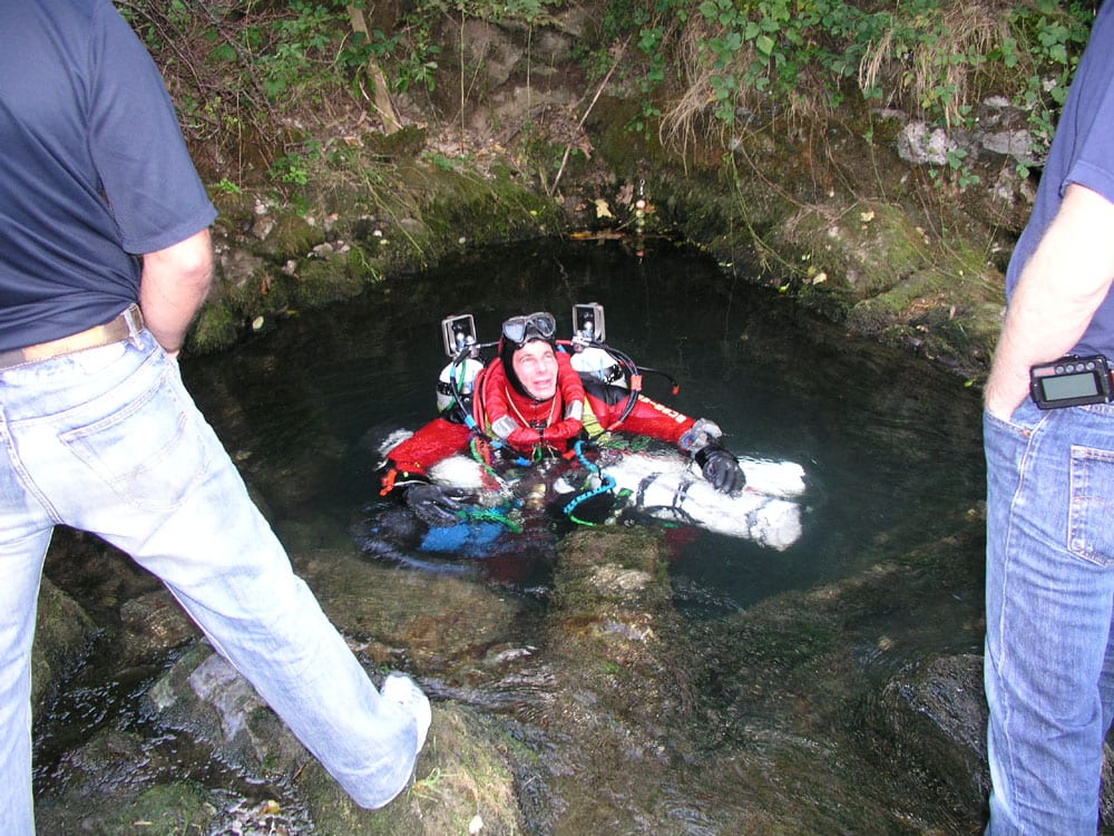 Today, this cave has been explored to the depth of -160 meters, for a penetration of 600 meters. It is the deepest in Switzerland. The first push dive has been succesfully attempted by Cyrille Brandt in 1988. We will have to wait for almost 20 year to see Michael Walz, with his home-made EDO 04 rebreather, make a push dive to -160 meters on the 19th of februar 2006.