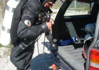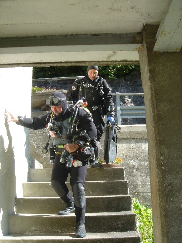 Gasmässig waren wir schlank ausgerüstet: Je eine Stage mit einem Ntx, ein D10, resp. ein D12 mit einer gepflegten Füllung (homöopathisch) für den Rest und noch eine 10l, resp. 4l Flasche O2 für die Deko ab 6m.