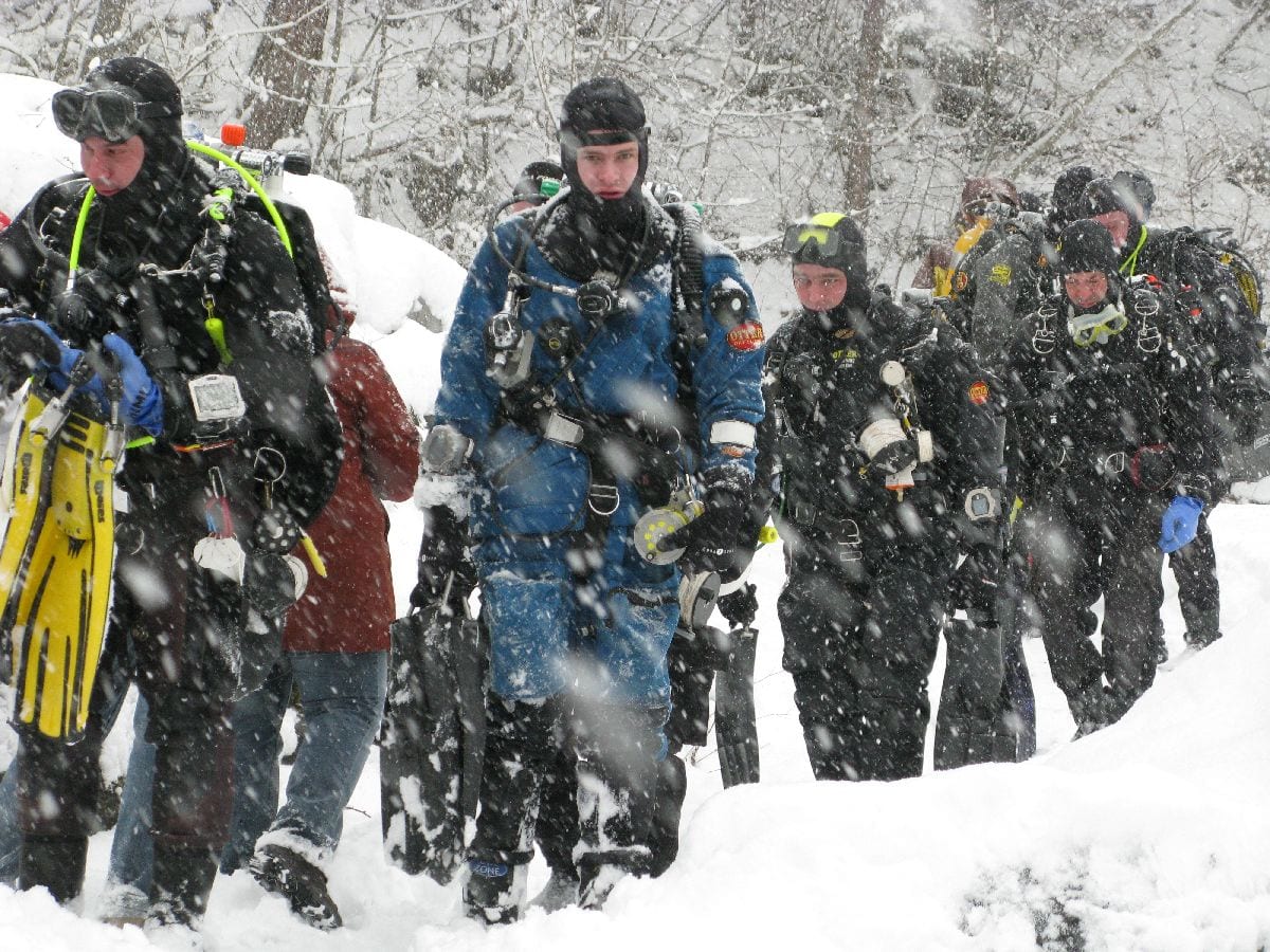 Bei buchstäblich haarsträubenden Wetterverhältnissen wurde der erste Tag des Praxisteils im Lago Mio bei Weesen durchgeführt. 20-30cm Schnee durch den Tag hindurch, Schneestürme mit Sichtweiten von max. 10m.