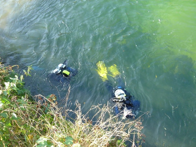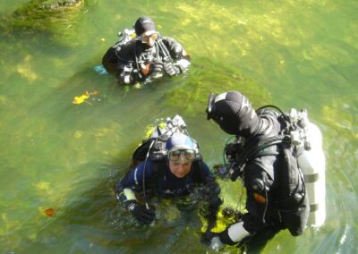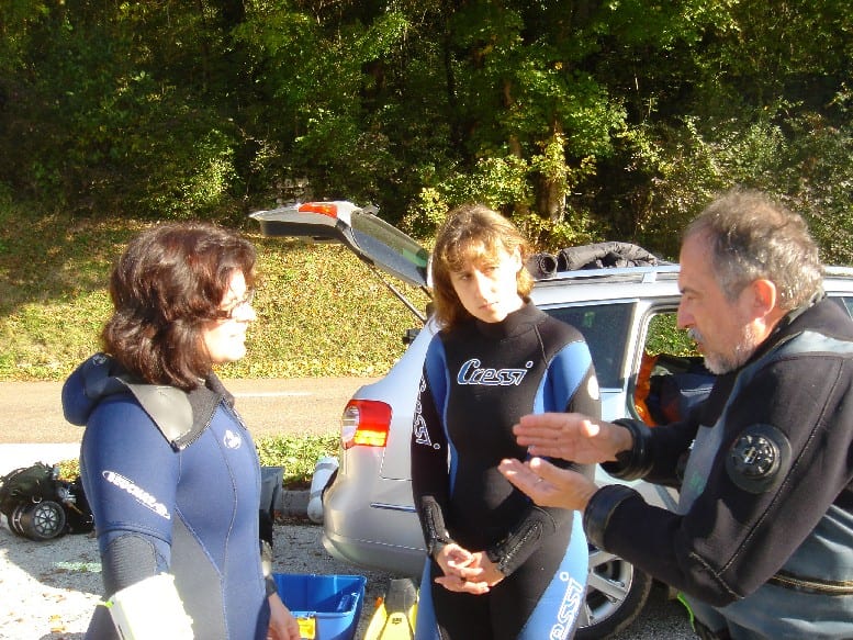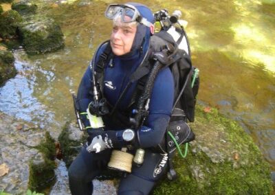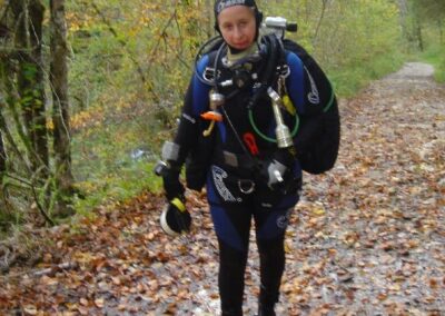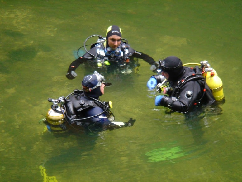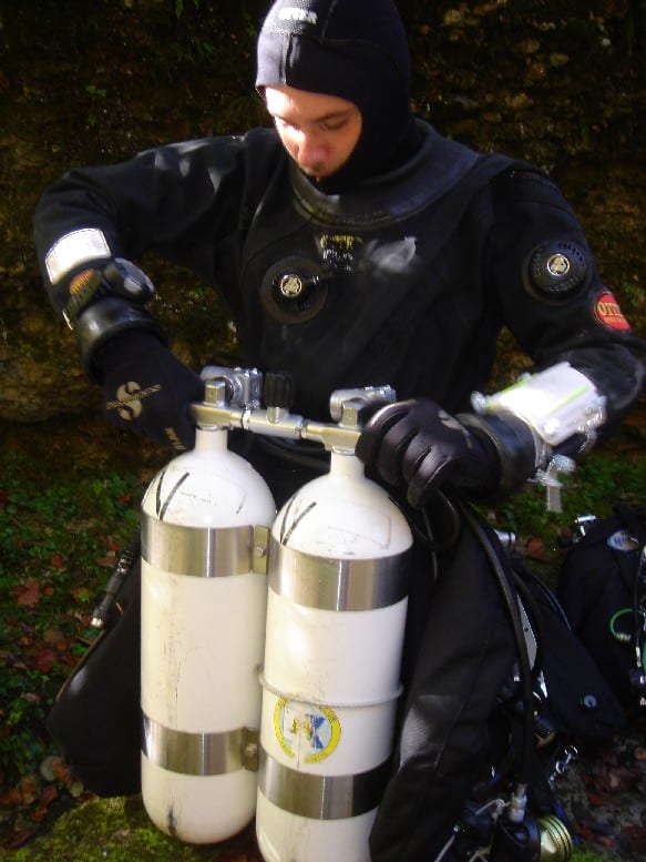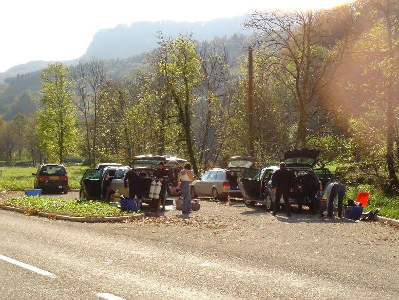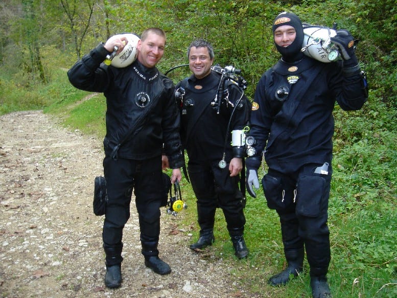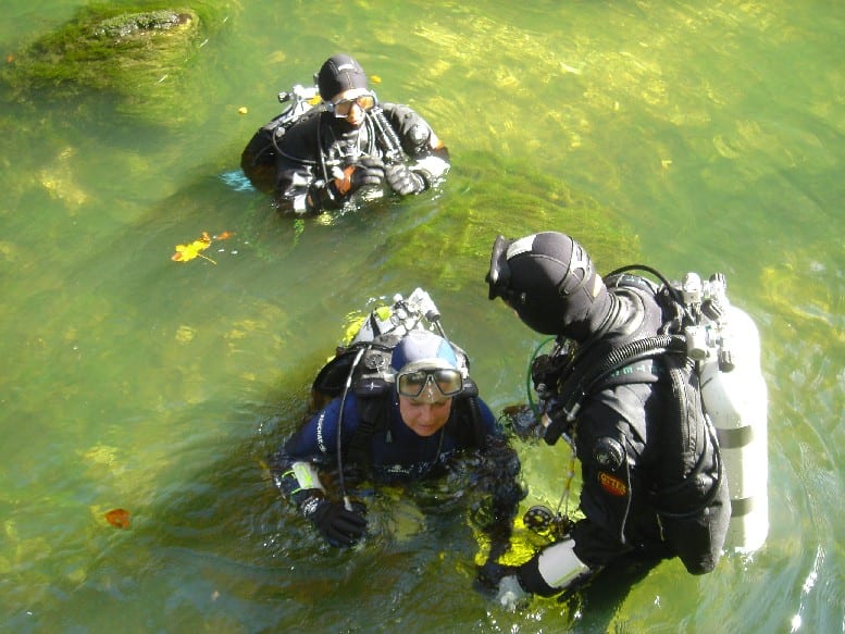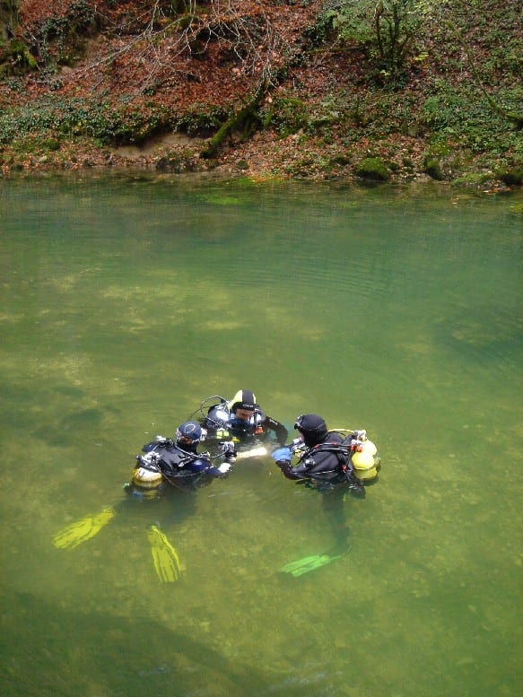 schon wieder ein Kurs erfolgreich beendet! Unser neuer Cavern Instructor Patrick Houtsch aus Luxemburg konnte am letzten Wochenende erfolgreich seinen ersten eigenen HT1 Kurs für Swiss Cave Diving im französische Jura abschliessen. Getaucht wurde an diesem WE an der Source de l’Ain bei Conte (Samstag) und an der Gouron (bei Lods). Während die Sichtverhältnisse an der Source de l’Ain ganz passabel waren (3-5m), konnte man zwar an der Gouron dasselbe zuerst auch meinen, mindestens wenn man in den Fluss, die Loue, hinunterschaute. Die Regenfälle der vergangenen Tage hatten aber massiv Laub und Sedimente in die Höhle hineingetragen, so dass nach wenigen metern praktisch Nullsicht herrschte und zur Umkehr zwang. Für die Kursteilnehmer trotzdem eine wertvolle Erfahrung…..